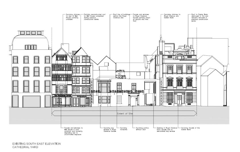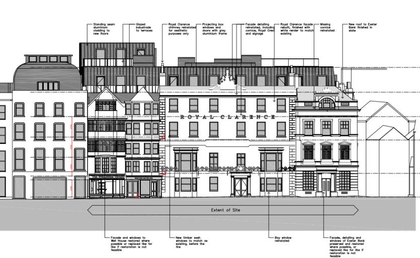 The facade, detailing and windows of the Exeter Bank building next door will be preserved, restored or replaced like for like.