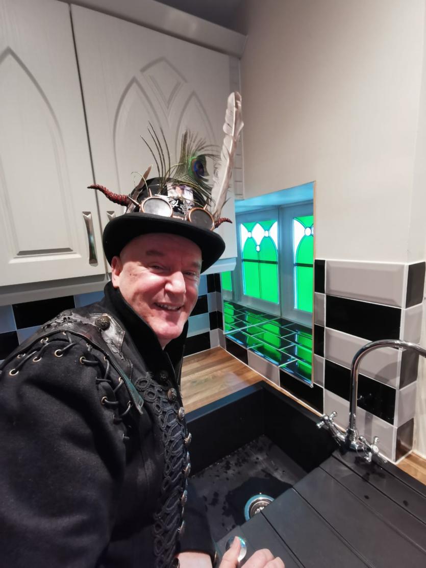 Having discussed our plans to create bespoke tours, Tui gave me a guided tour of the available apartments, along with another room, a work in progress, where she envisions guest speakers, including myself, giving talks, which I’m more than happy to be involved in. Visiting the accommodation, known as The Nest (or now The Nest and Crown) and The Annexe, we took some pictures, to be used in the build up to the press release, and whilst in The Annexe, my attention was drawn to an optical illusion that has been created around the kitchen sink, by placing a mirror next to the window, made of striking green glass, which makes it look like the window ledge stretches into the room next door. Very clever. I was pleased to see that this particular window features on a postcard that is available during your stay at the castle, that you can send to your family and friends, making them very envious.