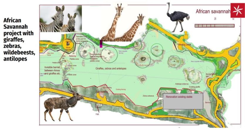 For Paignton Zoo plans for 2026 are to improve the routing, connecting five theme areas, to create a savannah with giraffes, zebras, wildebeests and antelopes, to reintroduce rhinoceroses, to create a new enclosure for camels, vicunas, rheas and maras and to build a new baboon rock for baboons and warthogs. In Newquay Zoo a savannah with giraffes will be created.