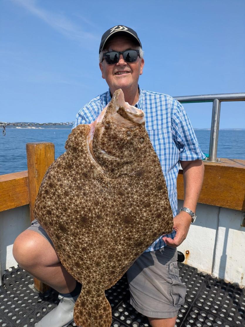 Stuart Pikes and his charter boat Orca fishing inshore out of Beer had a rare catch for them last week in the form of s turbot Weighing 13lbs 4oz, this is a new boat record and was landed by David Holman.