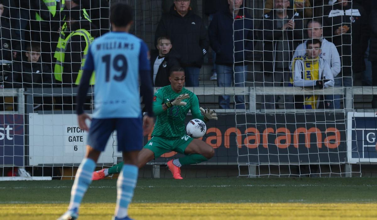 Torquay goalkeeper Rhys Lovett (pictured here making a save) and player Theo Williams v Dartford, 25th Nov 2023, Dartford, UK (Photo Credit: PPAUK/Pinnacle)