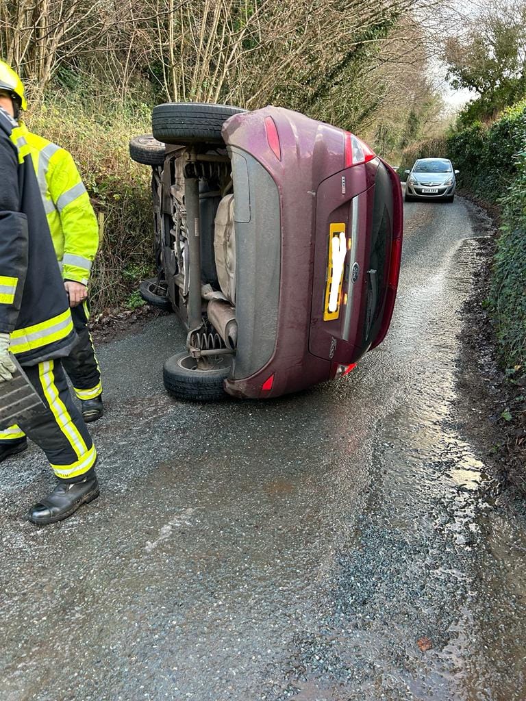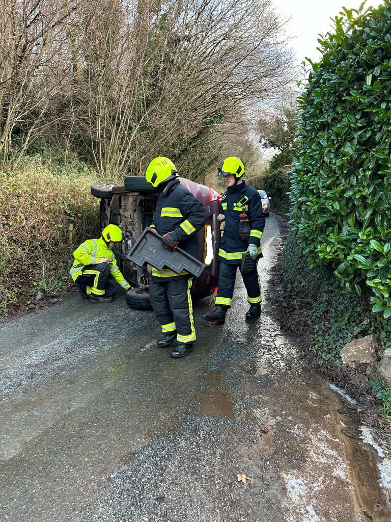 Fire crews from Torquay and Newton Abbot attended a serious road traffic collision after a car hit a patch of ice and flipped over. The Devon Air Ambulance were also in attendance.
