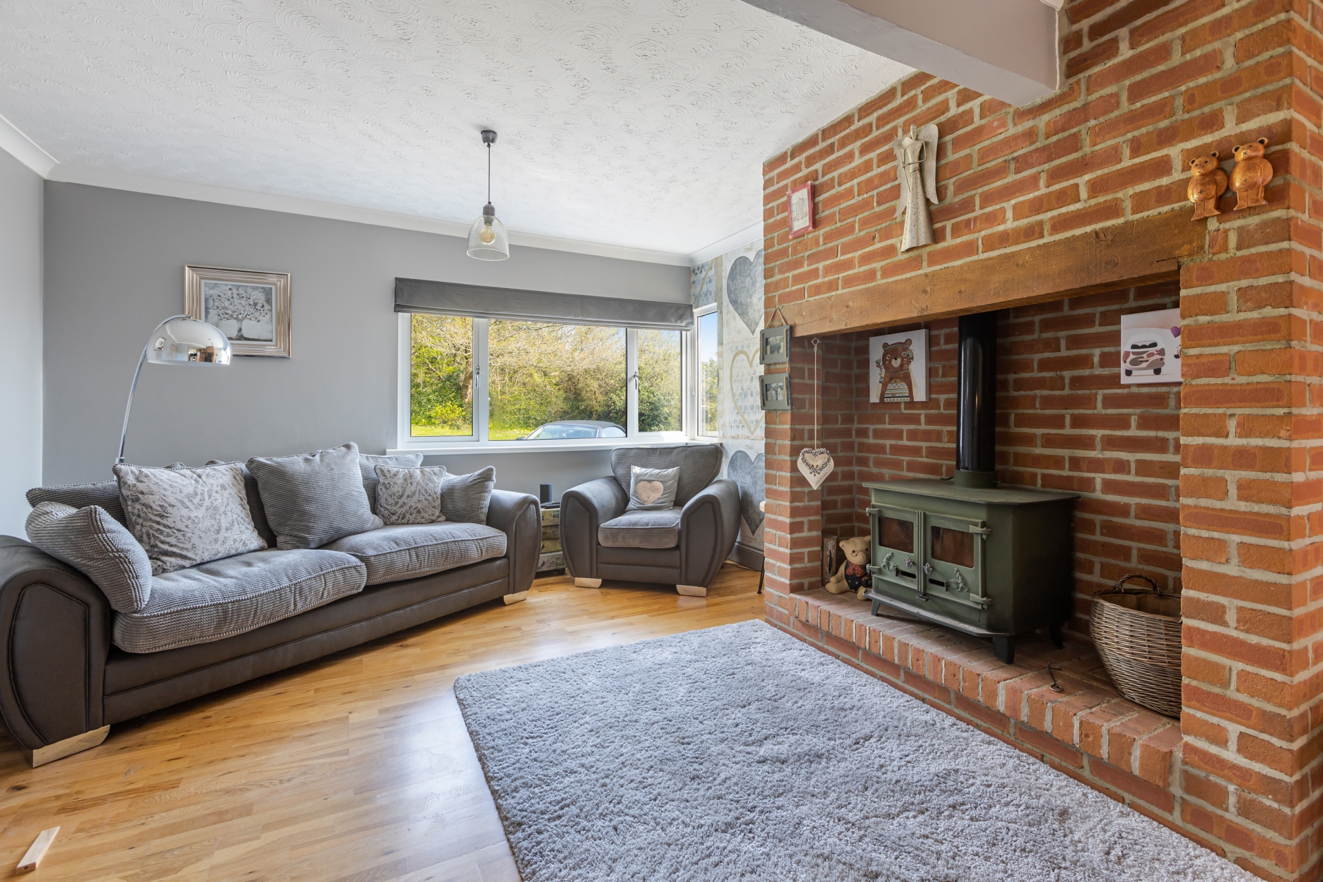 Stepping through the composite entrance door, guests are welcomed into the entrance porch with a tiled floor and side windows. The reception hall seamlessly flows into the recently upgraded kitchen, boasting pale grey, shaker-style units and slim profile worktops. Equipped with provisions for a range cooker, dishwasher, washing machine, dryer, and American-style fridge/freezer, the kitchen offers both functionality and style. The adjacent dining room enjoys a dual aspect, with views over the front garden and driveway, while the sitting room features an exposed brick inglenook fireplace, perfect for cosy evenings by the log burner. From the sitting room, a glass block wall allows natural light to filter into the snug lounge, offering exceptional views of the rear garden, terracing, and the rolling hills beyond.