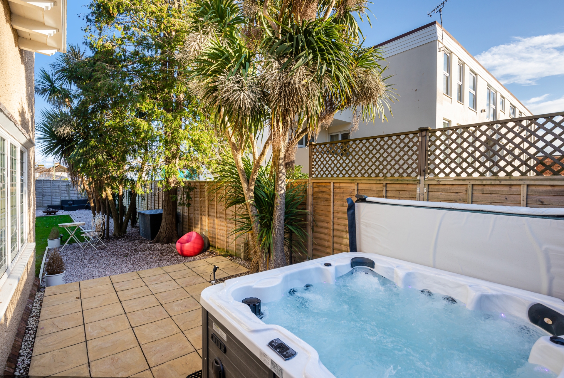 The generous garden features beautiful trees of Canadian Stone Pine, Monterey Pine tree, and Oak, being enclosed with a recently constructed natural stone wall with maturing shrubs and hedging which will provide privacy. Gravelled pathways lead to the bespoke pedestrian gated approach and along the front of the house to pleasant seating areas. A private patio area is located at the side of the property where a hot tub is currently located (not included in the sale).
