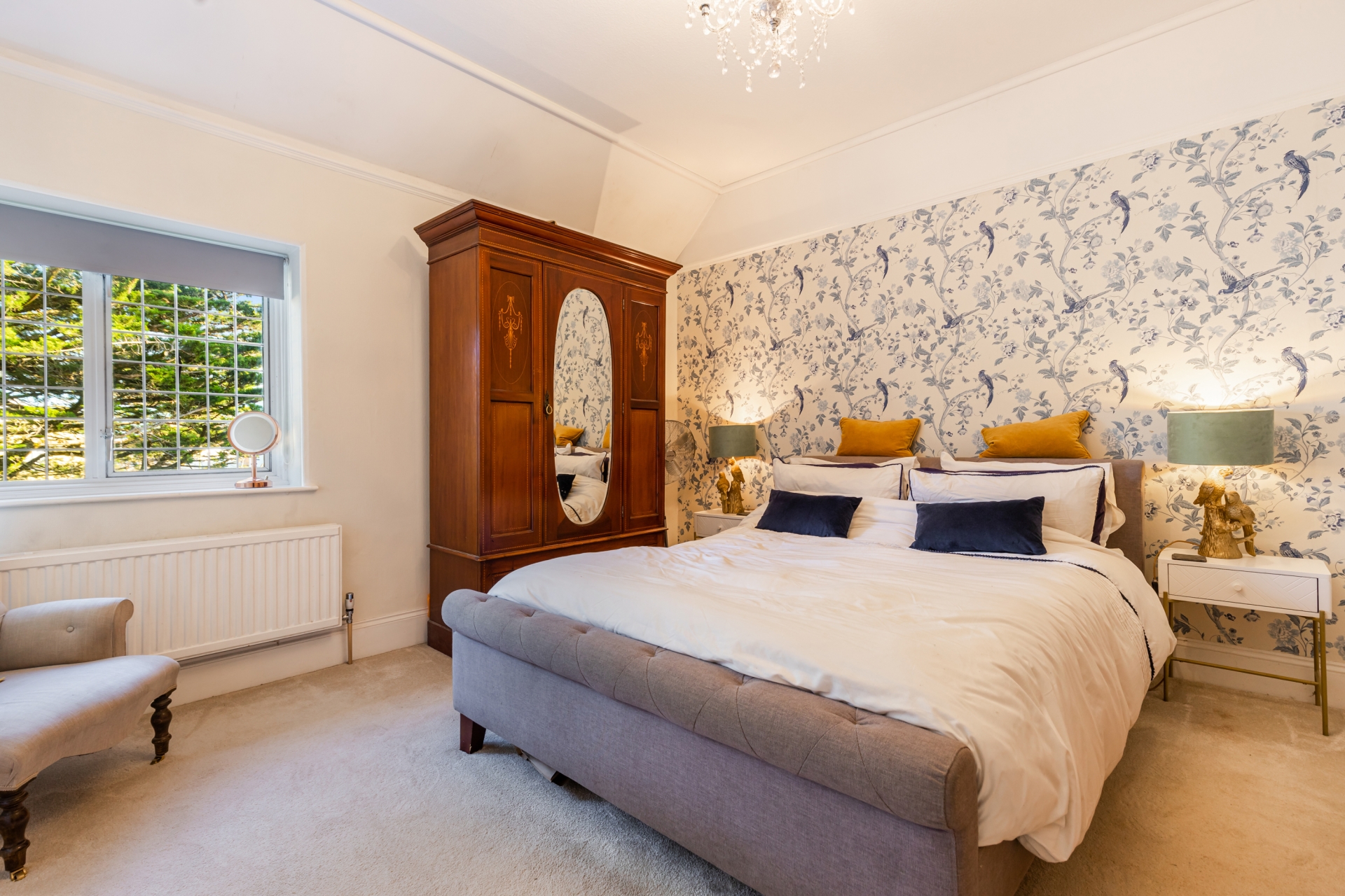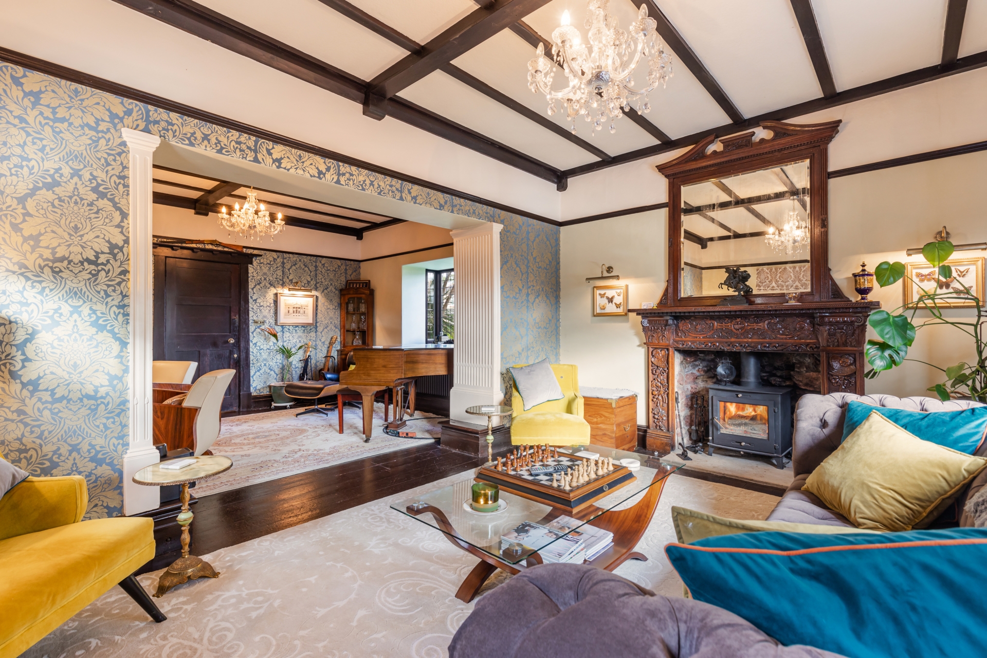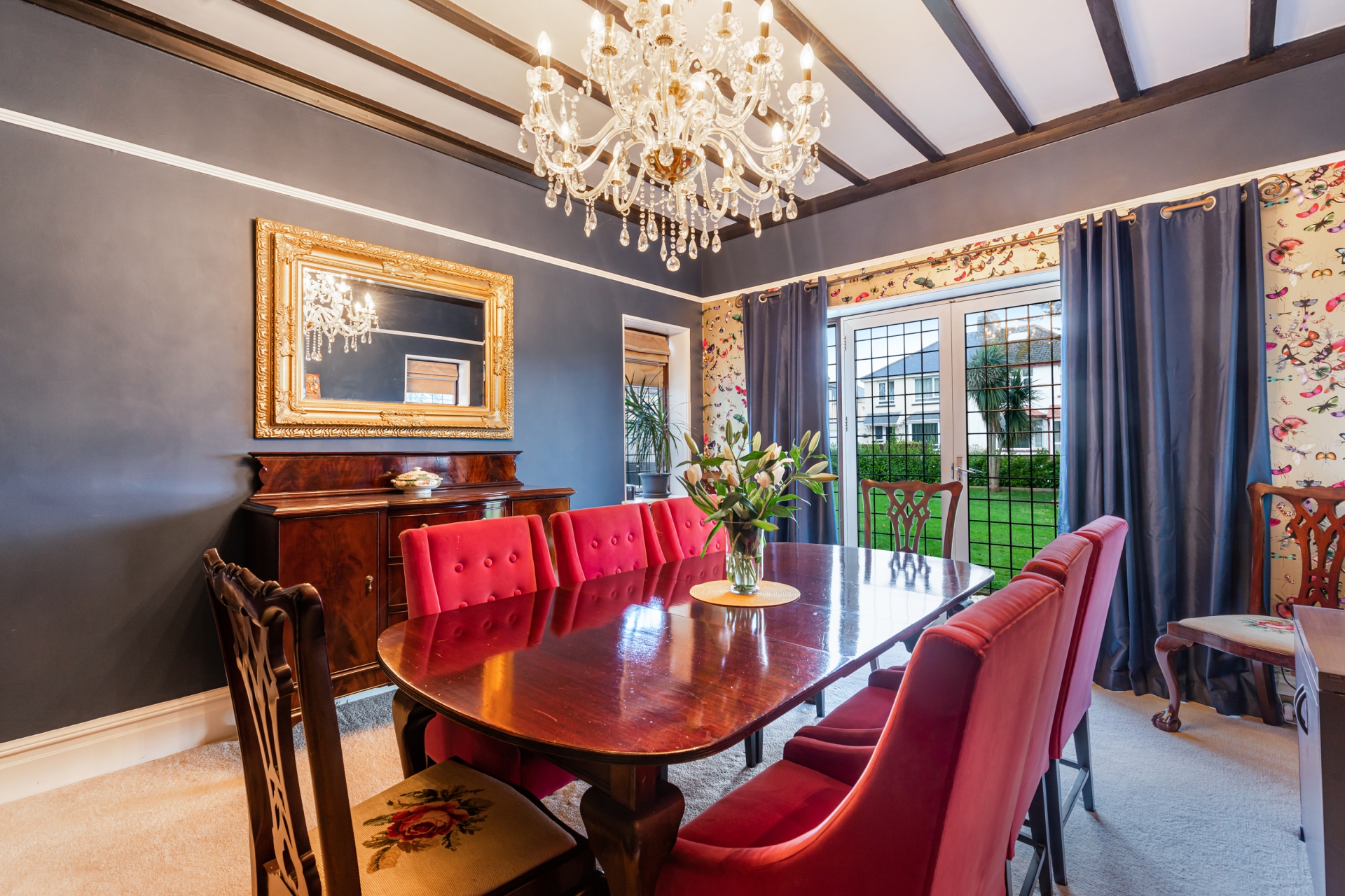 The sitting room is a striking room, tastefully decorated to enhance the period features which include picture rails, a beamed ceiling, exposed darkened floorboards, and ornate fireplaces with carved detailing, inset warming log burners and tiled hearths. The room is loosely divided with central feature pillars, with the initial room having two glass-fronted display cupboards set into the recess on either side of the fireplace. A leaded glazed window overlooks the front garden with a deep sill. The inner lounge area has two further leaded windows providing views over the garden and sheltered side patio. The dining room features a beamed ceiling, bold décor and contrasting wallpaper, and triple leaded windows with a lovely aspect over the garden. The breakfast room is utilised as a snug lounge with a leaded window and deep sill overlooking the garden.