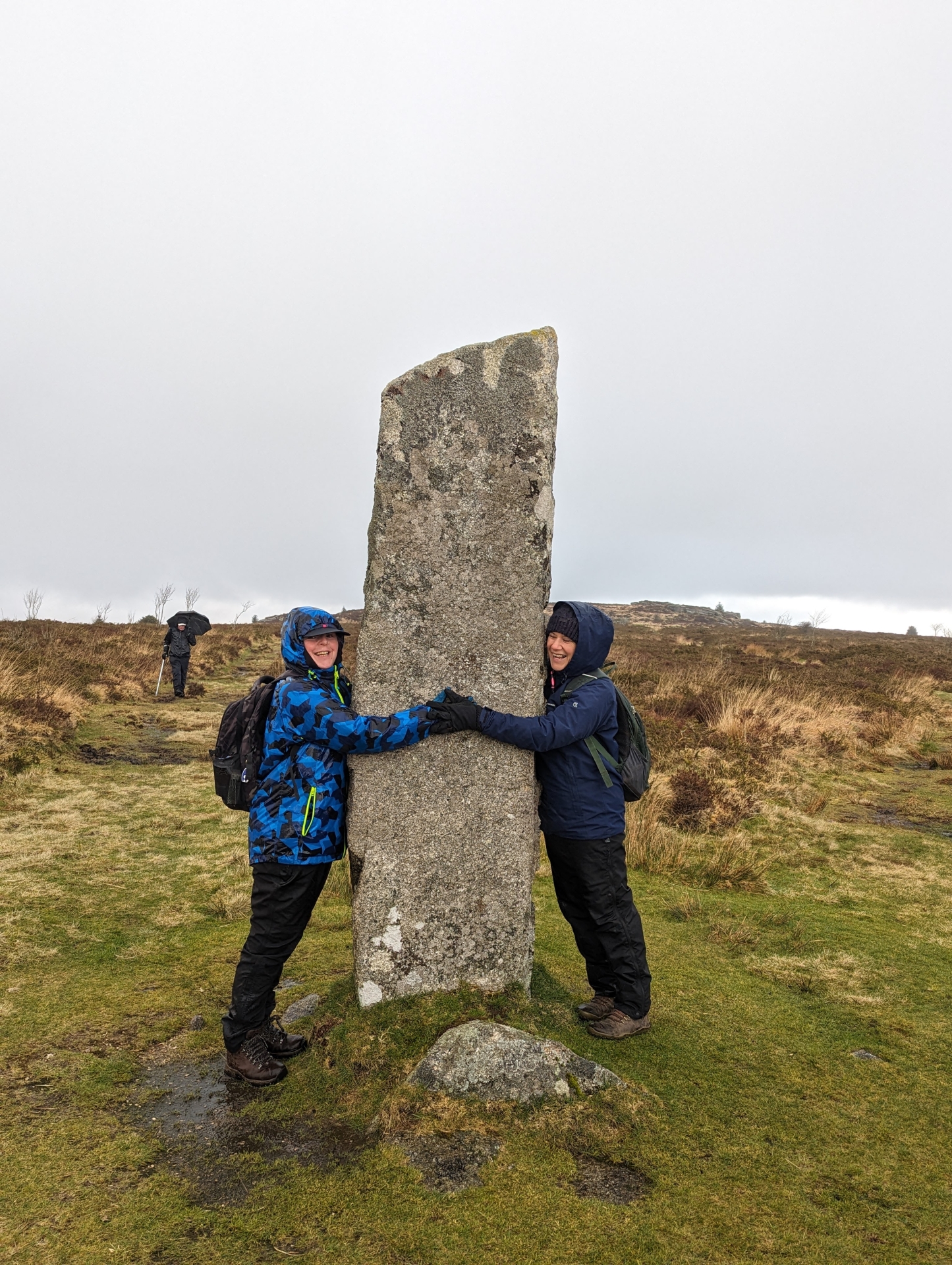 Whilst in the area, we went to pay our respects to Laughter Man, one of my favourite standing stones on the moor. Passing the nearby Sheepfold, we had a photo op with the Man, including some overenthusiastic hugging, sadly in a passing shower.