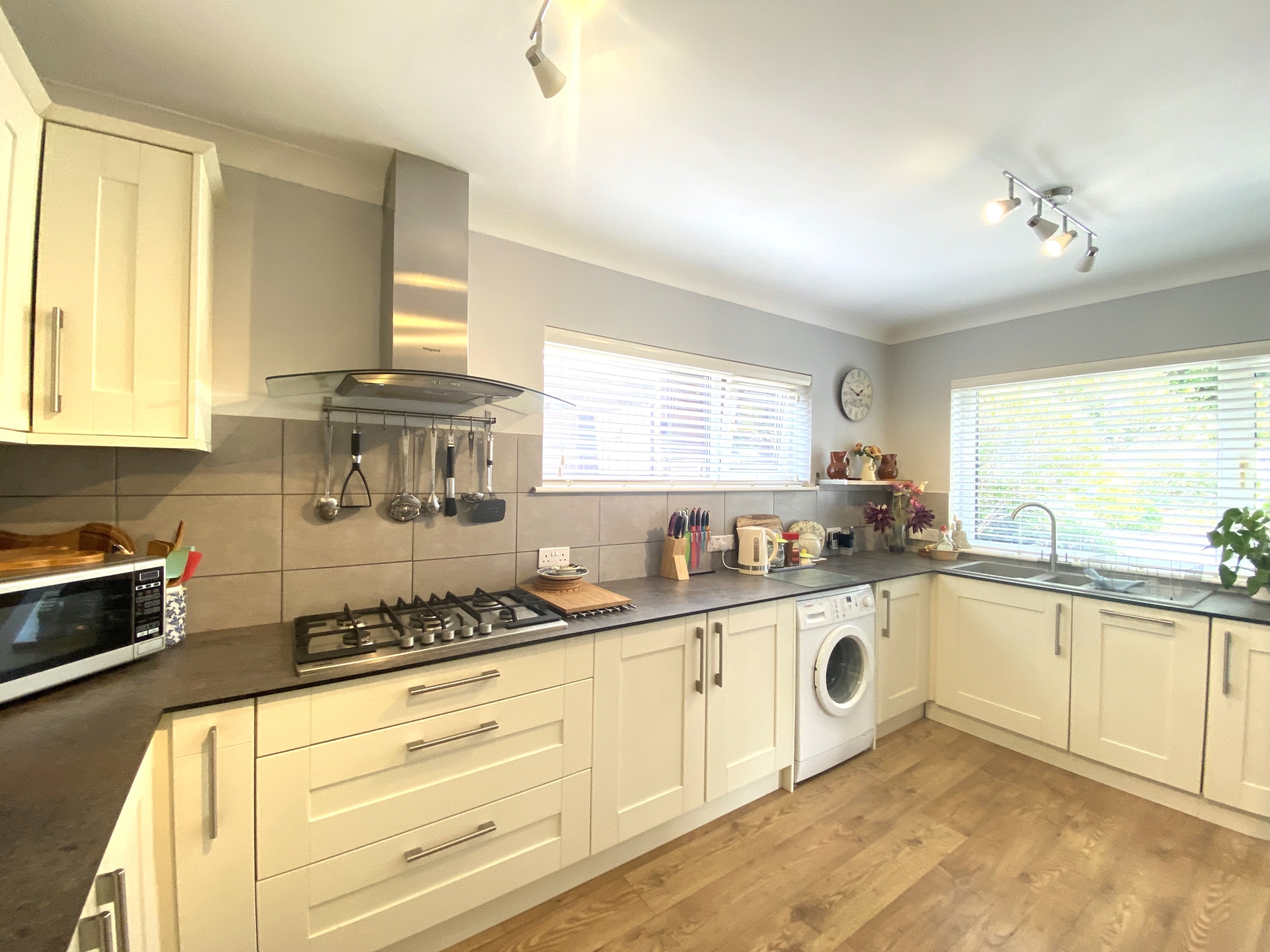 The kitchen features directional spotlights, dual aspect with UPVC double glazed windows to rear and side, a tall radiator with thermostat control.