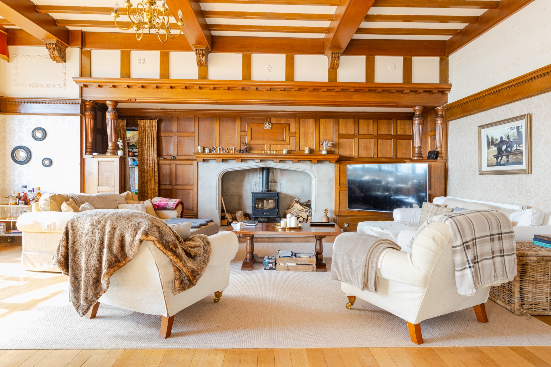 The study features a hardwood carved fire surround and mantel, exposed beamed ceiling and leaded light windows overlooking the terracing and gardens. Ornate double doors open to the impressive drawing room with statement Minster fireplace housing a warming log burner. Oak flooring, leaded light bay window overlooking the gardens, exposed beamed ceiling, and decorative panelling. Leading off the drawing room is a versatile family room with glazed surround and French doors to the terracing and gardens.