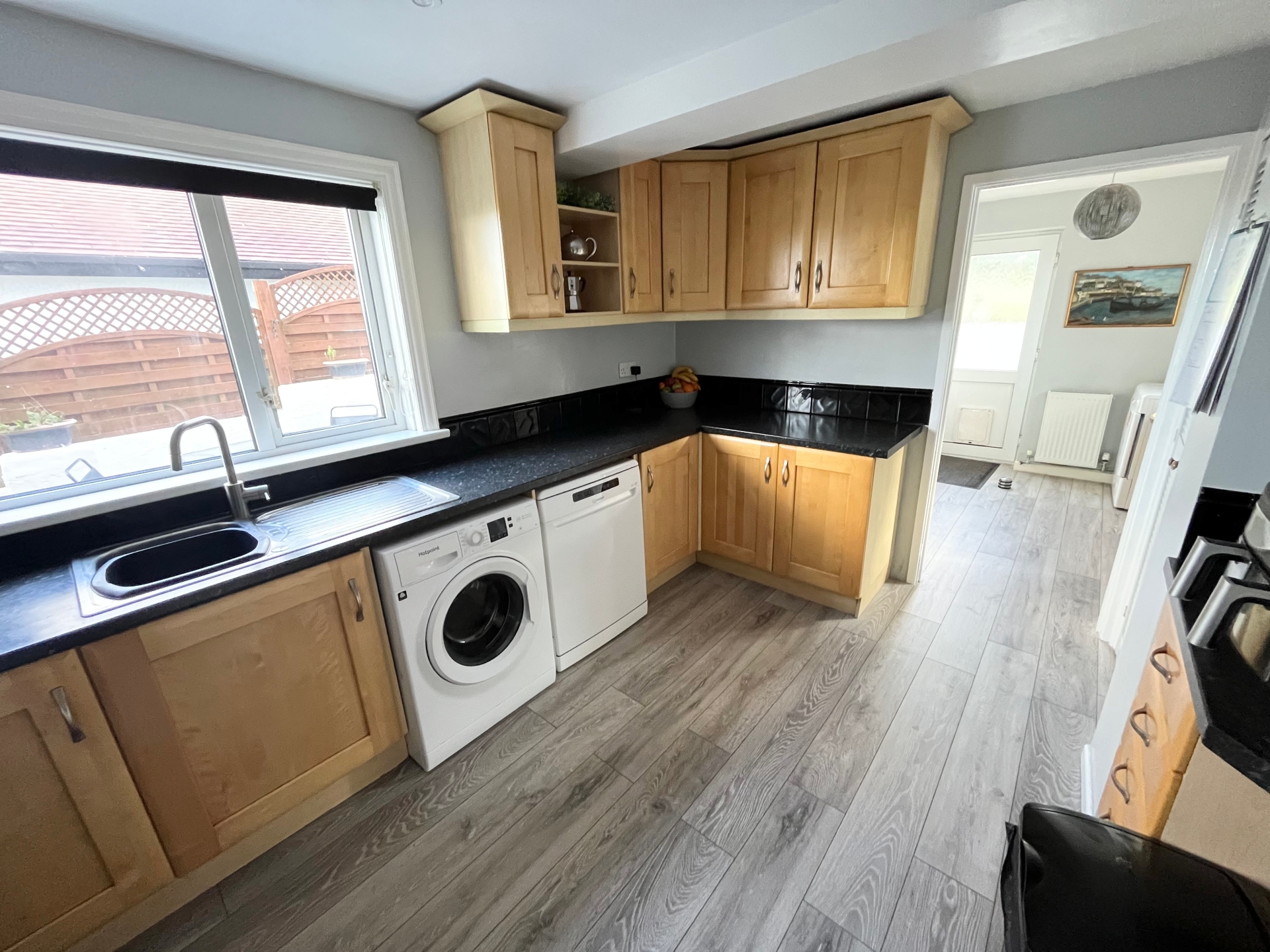 The kitchen features matching base and drawer units, laminate wood effect flooring, an inset stainless steel sink with matching drainer, uPVC double glazed windows to the side, roll edged work surfaces, space and plumbing for a washing machine, inset ceiling spotlights, smooth finish ceilings, space for a range cooker, space and plumbing for a dishwasher, space for an upright fridge freezer and a cupboard housing a wall mounted combination boiler controlling the central heating system.