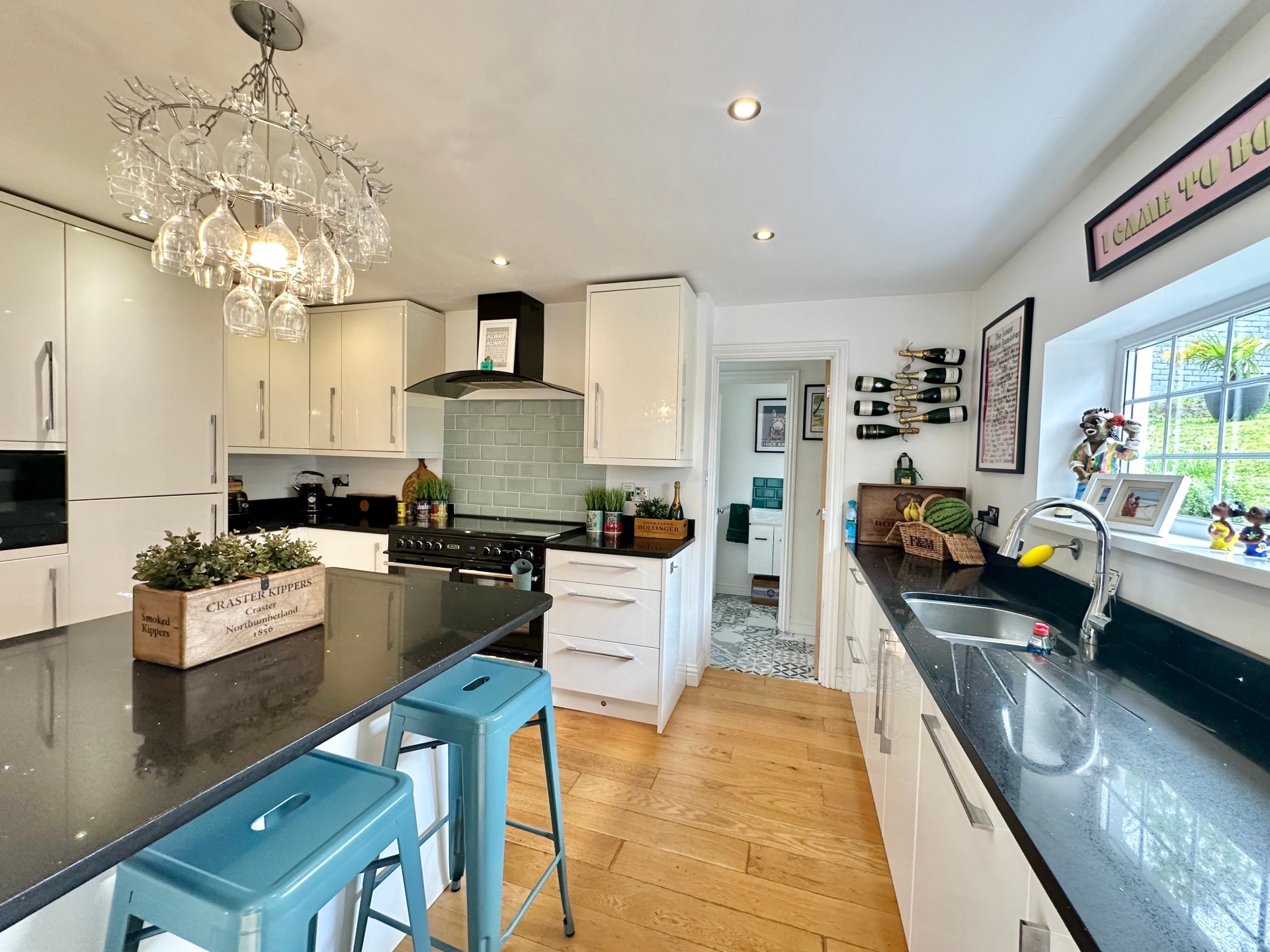 The kitchen is beautifully fitted with matching wall, base, and drawer units, square edged quartz worktop over, a UPVC double glazed window to the rear aspect, smooth finish ceilings, spotlights, built-in dishwasher, built-in fridge and freezer, built-in eye-level microwave and engineered oak flooring.