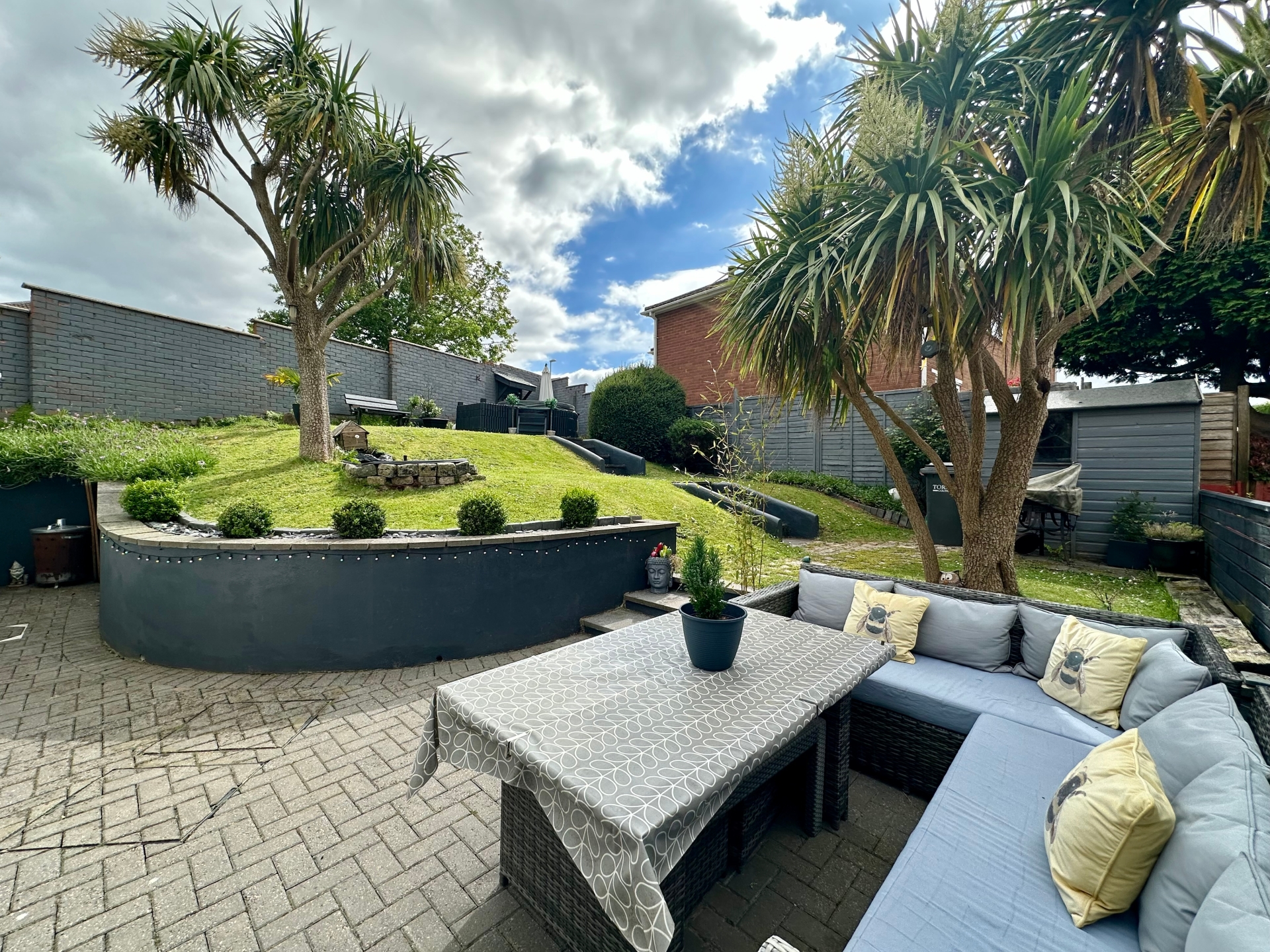 The property is further complemented throughout with UPVC double glazed windows and has gas central heating. To the rear and accessed from the dining room is a good-sized patio with a pathway continuing to gated access to the front. The remainder of the garden is tiered to the top boundary, mainly laid to lawn and with some open views.
