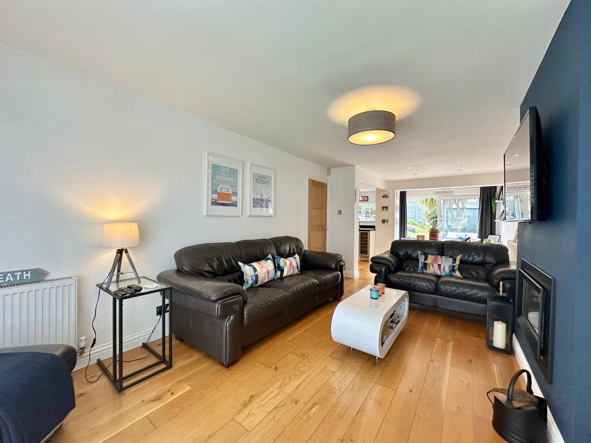 The sitting room is a contemporary open-plan living area with engineered oak flooring, a radiator, ceiling light points, a TV aerial point, a UPVC double glazed floor-to-ceiling window, and an inset wall-mounted living flame gas fire with log burning effect. The dining area continues the engineered oak flooring, has smooth finish ceilings, inset spotlights, a radiator, and UPVC double glazed sliding doors providing access to the rear garden.