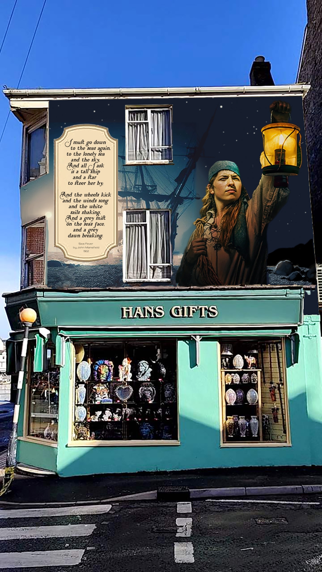 The chosen flank wall stretches from the corner of Costa Coffee down to the Long Bar public house. It is one of the largest wall elevations in the town and is located in a historic spot where sailors would have come ashore to collect supplies for their ships, sheltering below the Napoleonic forts at Berry Head.