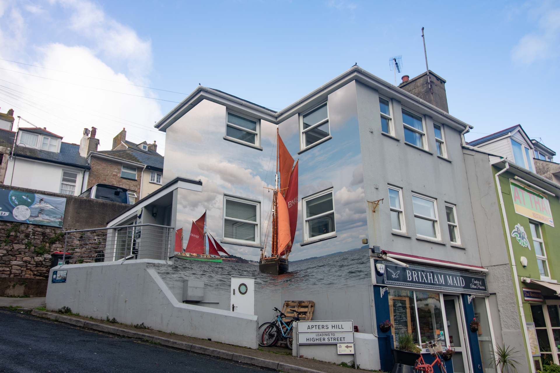 The first new mural site is on the corner of Middle Street and Apter Hill, on the high side elevations. The intended mural takes inspiration from Brixham’s local heritage fleet including the Vigilance and Provident sailing trawlers with their characteristic red sails. The work is planned to start around September 9 and take about two weeks to complete.