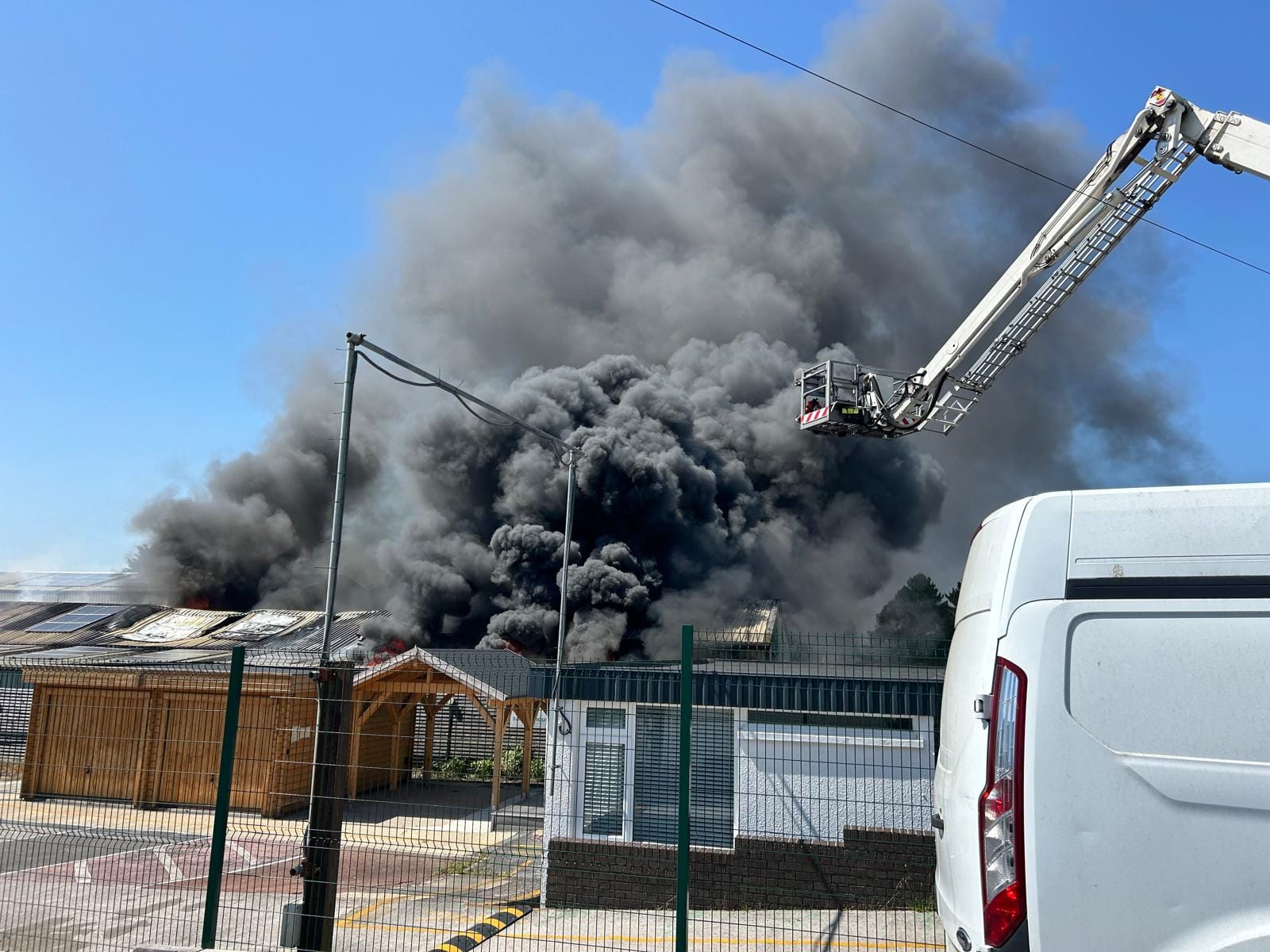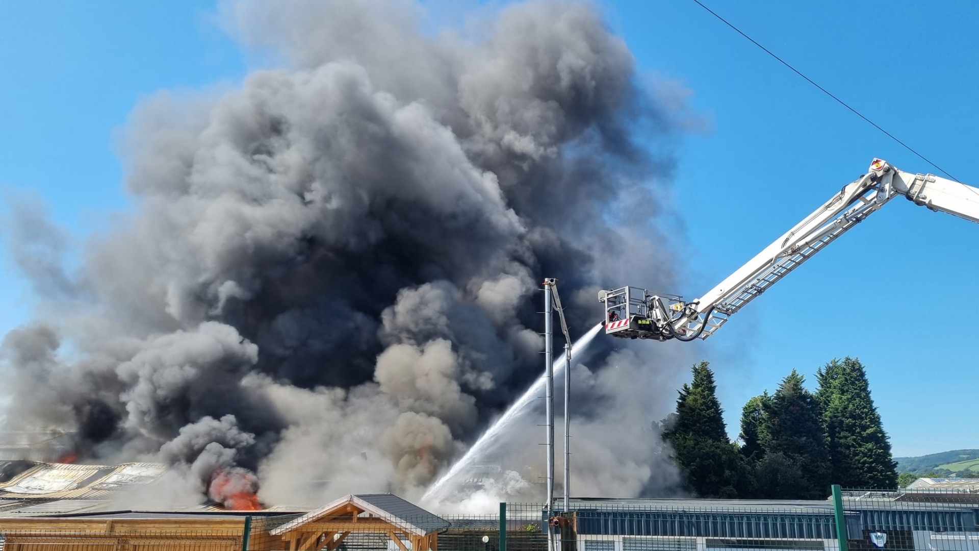 Upon arrival, crews encountered heavy smoke and fire from the roof of a vehicle workshop. Due to the danger from exploding cylinders and structural collapse, a defensive approach was adopted. The ALPs were used as water towers to fight the fire from above, while ground monitors maintained water flow to the fire.