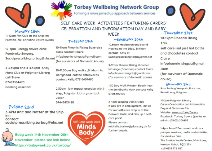 The Torbay Wellbeing Network Group has announced a schedule of activities for local residents in celebration of National Self-Care Week 2024, running from Monday, November 18, to Sunday, November 24.