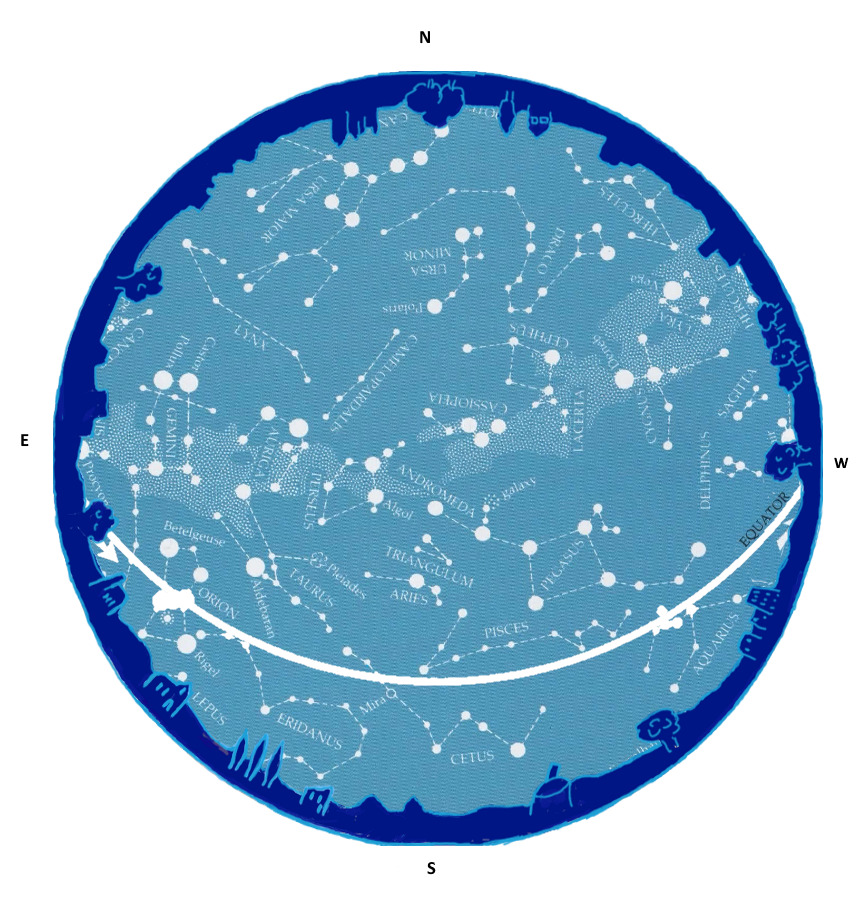 Sun: From the beginning to the end of the month, the period of dark sky increases by an hour. At the beginning of the month, the sun sets before 5pm and by the end of the month, by 4.15pm after which there is the twilight period. The nights are really drawing in now and there are less than ten hours of daylight, making November a good time to observe fainter deep sky objects such as M42, The Great Orion Nebula, which is actually visible to the naked eye from a dark site. This cloud of gas is a star forming region in space and can be seen easily in binoculars or a small telescope. Find the three stars that form the asterism of The Belt of Orion and then drop vertically down from the middle star of these three. You will come to three much fainter stars forming the “sword”. The bottom one of these should seem rather fuzzy. This is the nebula, a cloud of glowing gas and not a star at all (although it contains newly formed, hot, young stars).
