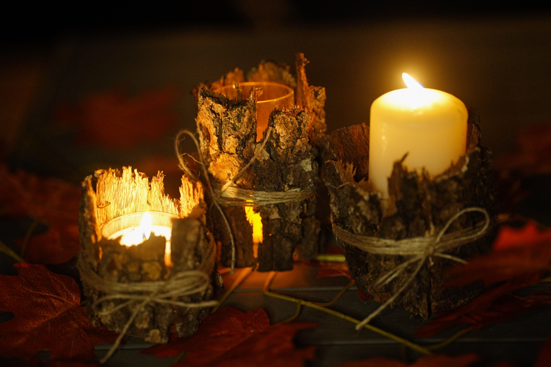 Create a magical glow with candles nestled in tree bark holders. If birch isn’t available, wrap plain glass jars with bark-like craft paper for a similar effect. Place them on a bed of moss or small stones for an earthy, woodland feel. The soft flicker of candlelight paired with natural textures creates a warm and inviting ambiance.