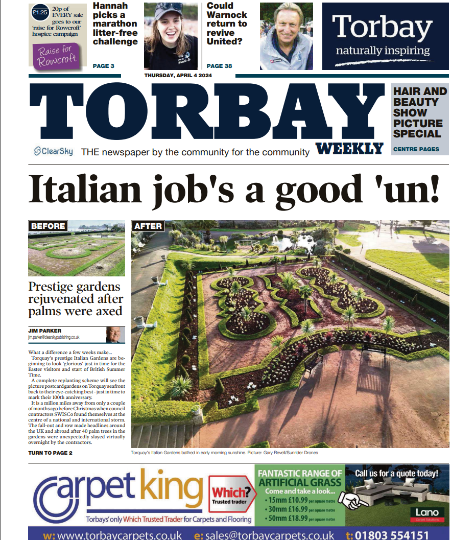 April: After Torbay Council’s gardens company unexpectedly cut down 40 iconic palm trees in Torquay’s Italian Gardens, residents welcomed ‘glorious’ photos of the seafront gardens during a rigorous replanting scheme. Just in time for Easter, the revised planting offered a long-term solution for this key public space.