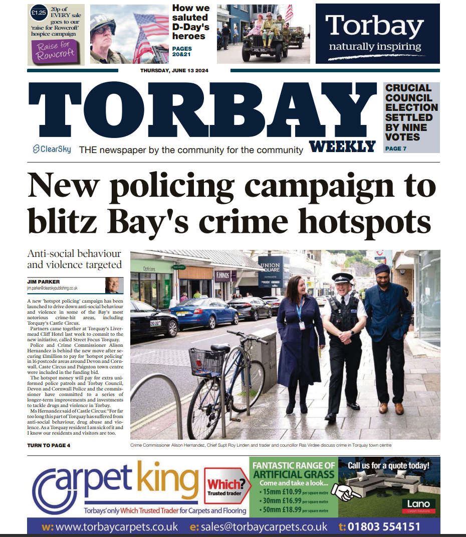 June: The summer began with the launch of a new ‘hotspot policing’ campaign aimed at reducing anti-social behavior and violence in Torbay’s most crime-affected areas, such as Torquay’s Castle Circus. Police and Crime Commissioner Alison Hernandez secured £1 million to fund the initiative across 16 postcode areas in Devon and Cornwall.