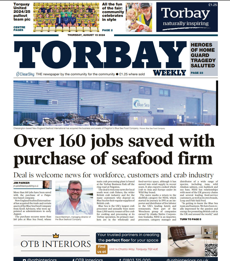 August: August brought relief with the preservation of over 160 jobs following the acquisition of a Paignton-based seafood firm. New England Seafood International acquired the trade and certain assets of the Blue Sea Food Company from Kroll Advisory, who were appointed as administrators earlier that month. It was welcome news for local southwest crab fishers, the wider British crab Industry and for the many customers that depend on Blue Sea for their regular supplies of British crab.