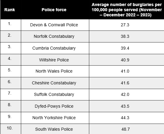 According to the findings, Devon & Cornwall Police have the lowest rate of burglaries during the festive period at 27.3, which is 59 per cent below the UK average of 66.2 burglaries per 100,000 people served.
