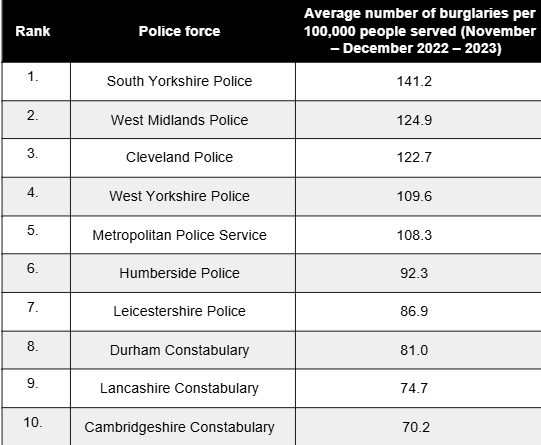 A new study by personal injury experts, claims.co.uk, analysed data from Data.Police.UK to find the number of burglaries recorded by each UK police force between November and December in 2022 and 2023.