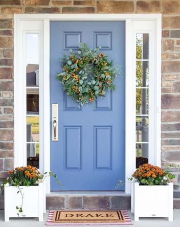 Frame your door with potted plants brimming with seasonal blooms. Choose vibrant flowers like pansies, petunias, or geraniums to create a stunning visual impact.