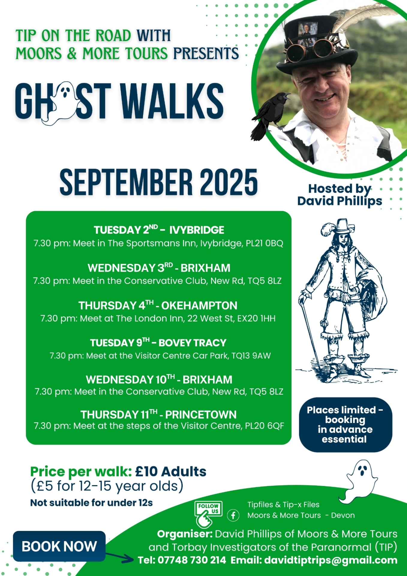 Also, before my season finishes, there are two further opportunities to join me on Ghost Walks, as part of this year’s Dartmoor Outdoor Festival, which runs from Friday 29th August, until Friday 5th September. My offerings will top and tail the week, with Ashburton on 29th, starting at 7.30pm, and Chagford on 5th at 6.30pm.