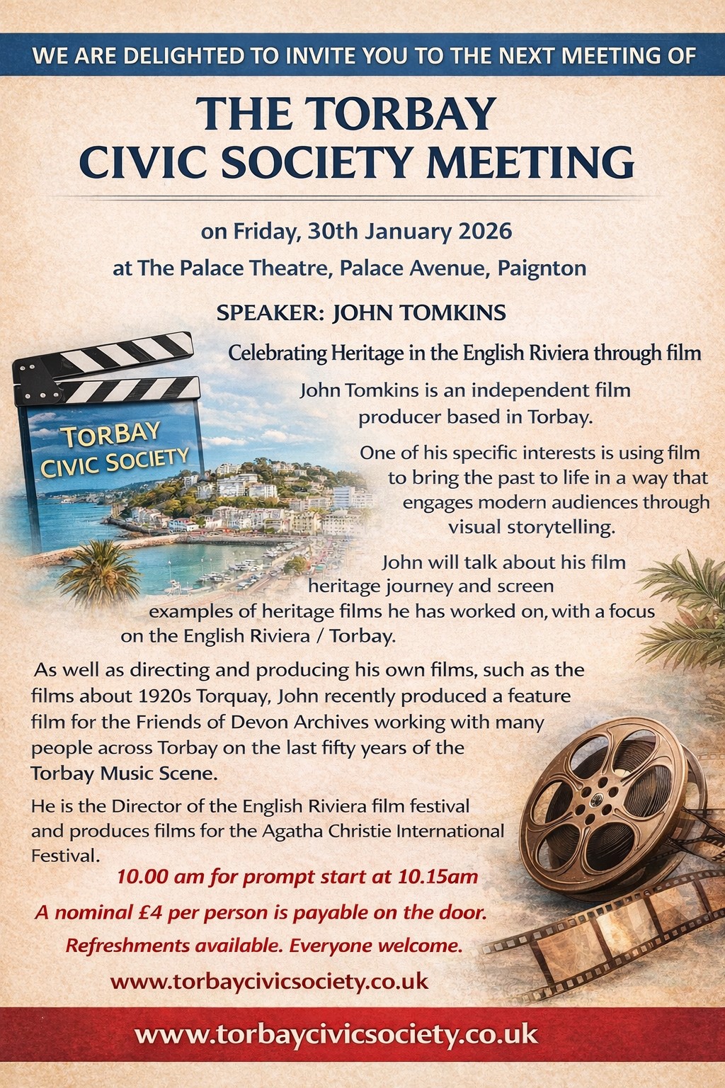 John will talk about his film heritage journey and screen examples of heritage films he has worked on, with a focus on the English Riviera/Torbay. As well as directing and producing his own films, such as the films about 1920s Torquay, John recently produced a feature film for the Friends of Devon Archives working with many people across Torbay on the last fifty years of the Torbay Music Scene. He is the Director of the English Riviera film festival and produces films for the Agatha Christie International Festival. So those of you who would like to come along are in for a treat.